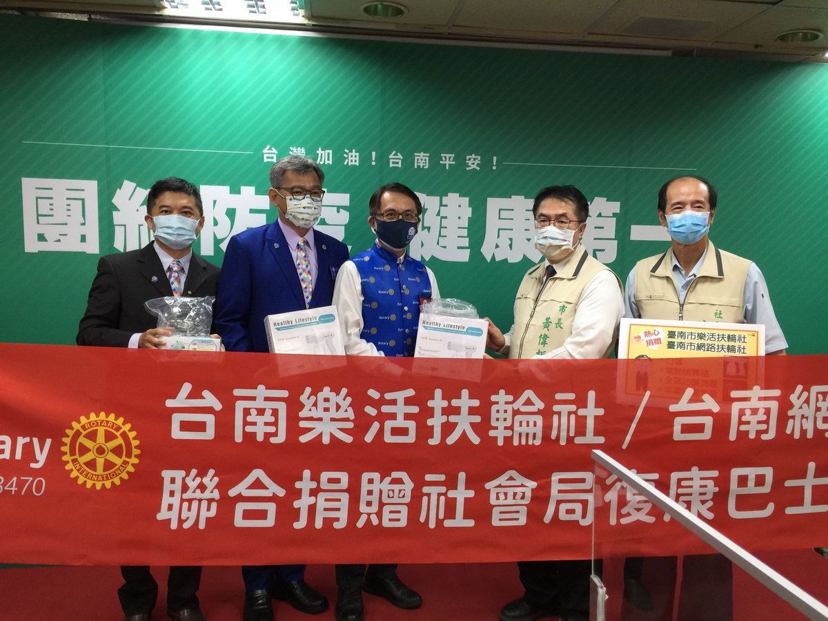 台南市樂活扶輪社及網路扶輪社集結社員的力量,聯合捐贈10枝電動噴霧槍、2,000個口罩、250個全罩防護面罩及50個半罩防護面罩,用實際行動支持復康巴士於防疫中仍辛苦出勤的服務人員。網路扶輪社楊孟璋社長表示,疫情期間全民共同防疫,市府盡全力防堵疫情的努力有目共睹,很榮幸有機會跟樂活扶輪社一起略盡棉薄心意,表達對市府防疫的支持。因自己父親曾中風臥床多年,每次復康巴士來接送,都讓家屬感到貼心又放心,希望這些物資能夠幫助復康巴士的司機們在防疫期間有更好的防護,並能放心服務每一位需要的人。